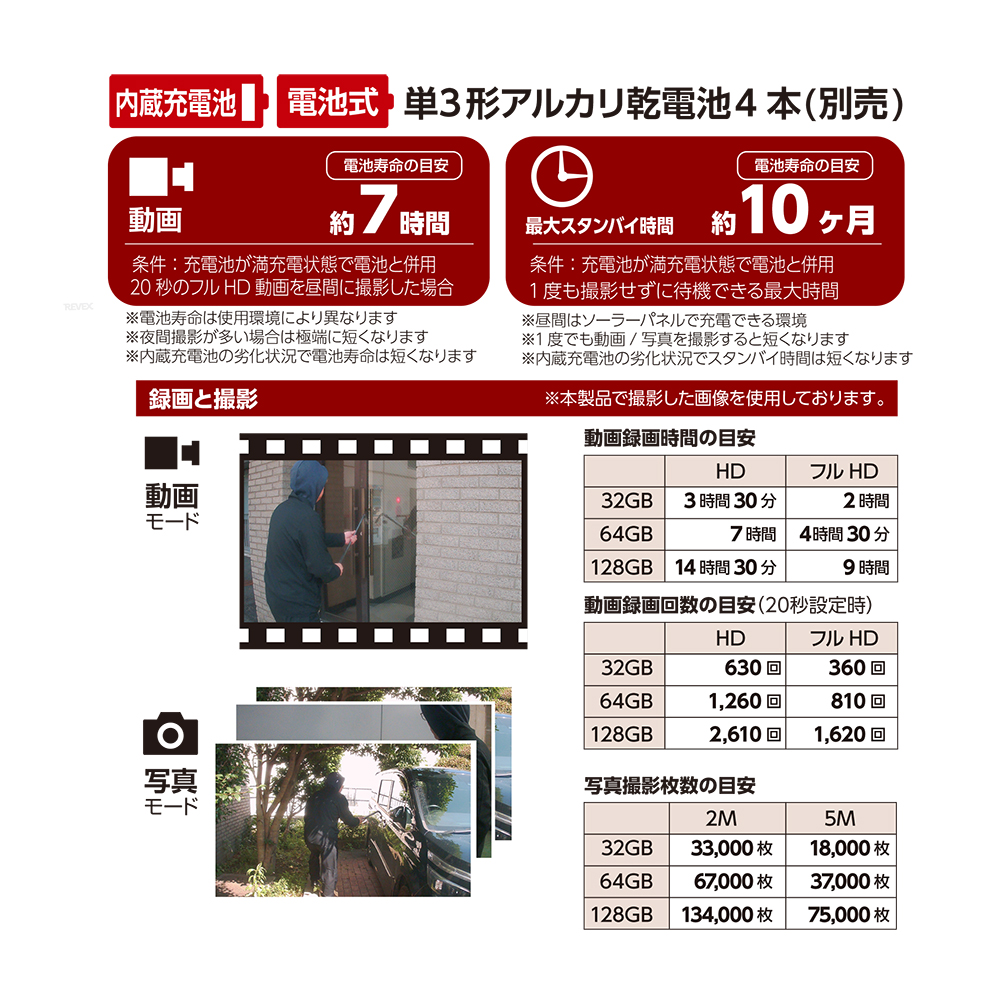 • 充電方式:ソーラーパネルでの充電/USBケーブル(カメラ側Type-C)での充電